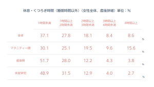 休息・くつろぎ時間(睡眠時間以外)(女性全体、産後詳細)